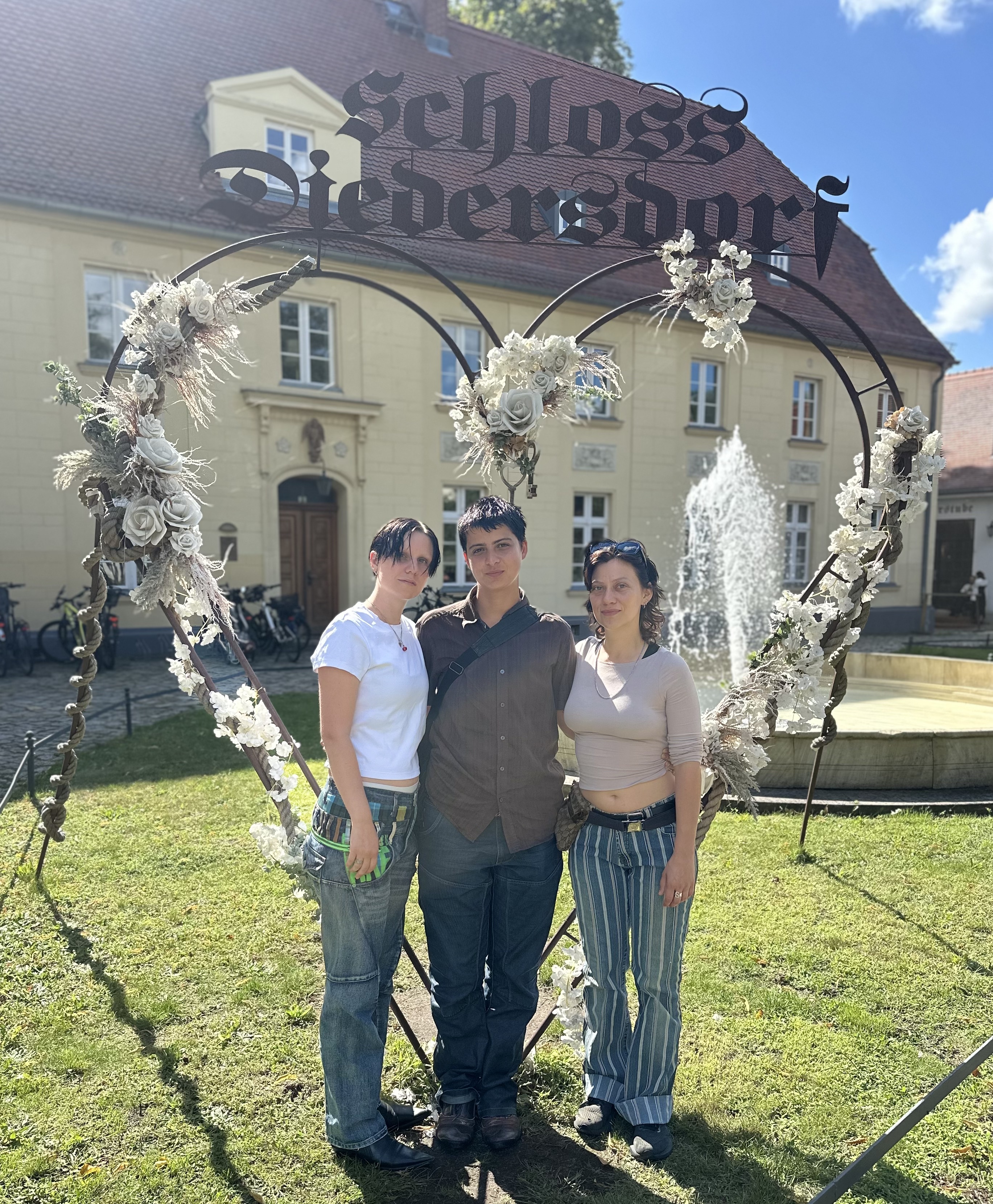 We met in Giessen while studying Applied Theater Science. We immediately knew that we were sisters. It wasn’t only our shared love for Virginie Despentes, Kathy Acker, Internet culture, Laurie Anderson or working nonstop… it was the way we all searched for something we couldn’t yet pronounce, but we knew that together we might find it. So we started doing silly things together on stage, trying to confront each other with topics that are taboo or that pushed our boundaries. We puked milk from our hearts, shot fireworks from our pussies, fucked with moving lights, wrote down violent fantasies, stripped our loneliness away, and made music with the swiss folklore accordeon, which Tina inherited from their grandfather. Everything we encountered past, present, and future could become material for our own worlds, into which we dreamed ourselves together.